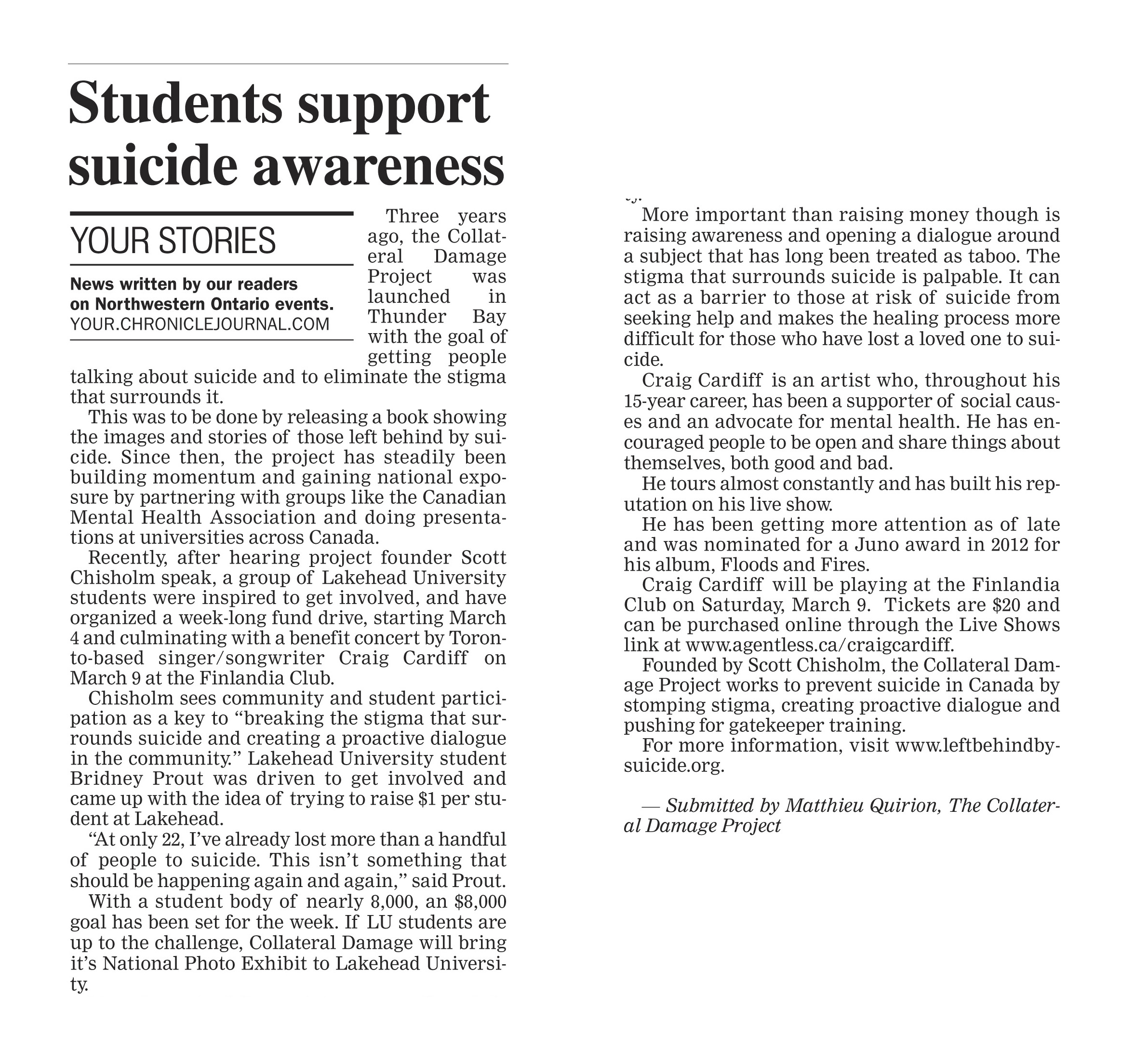 From March 4th through March 9th, Lakehead University (LU) students will be raising money for the Collateral Damage Project. The goal is to raise $8000 or $1 per student at LU. We will be looking for donations on campus and at local businesses. We are currently planning different events around campus during the week, culminating with a benefit concert by Craig Cardiff on Saturday March 9th at the Finlandia Club.